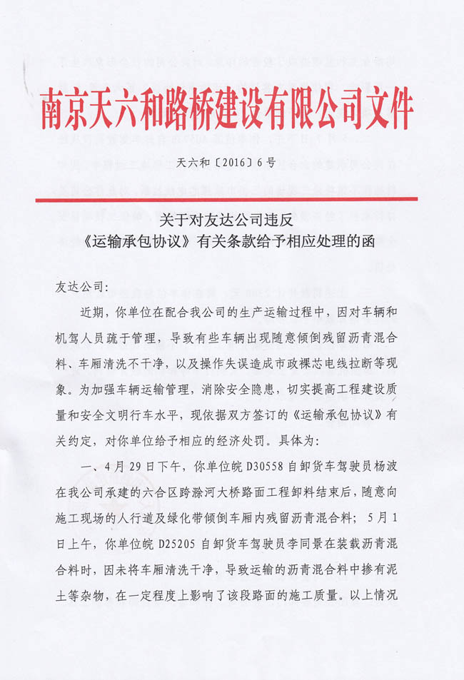 關(guān)于對友達公司違反《運輸承包協(xié)議》有關(guān)條款給予相應(yīng)處理的函