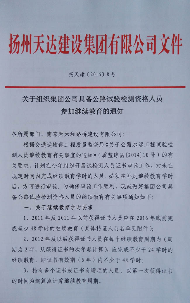 關于組織集團公司具備公路試驗檢測資格人員參加繼續(xù)教育的通知