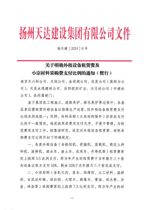 關(guān)于明確外租設(shè)備租賃費及小宗材料采購費支付比例的通知(暫行)