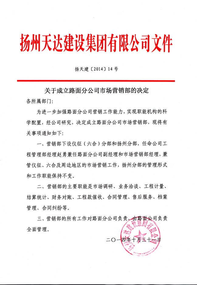 關于成立路面分公司市場營銷部的決定