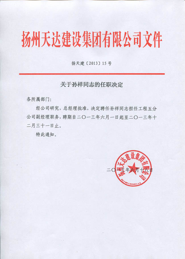 關(guān)于孫祥同志的任職決定