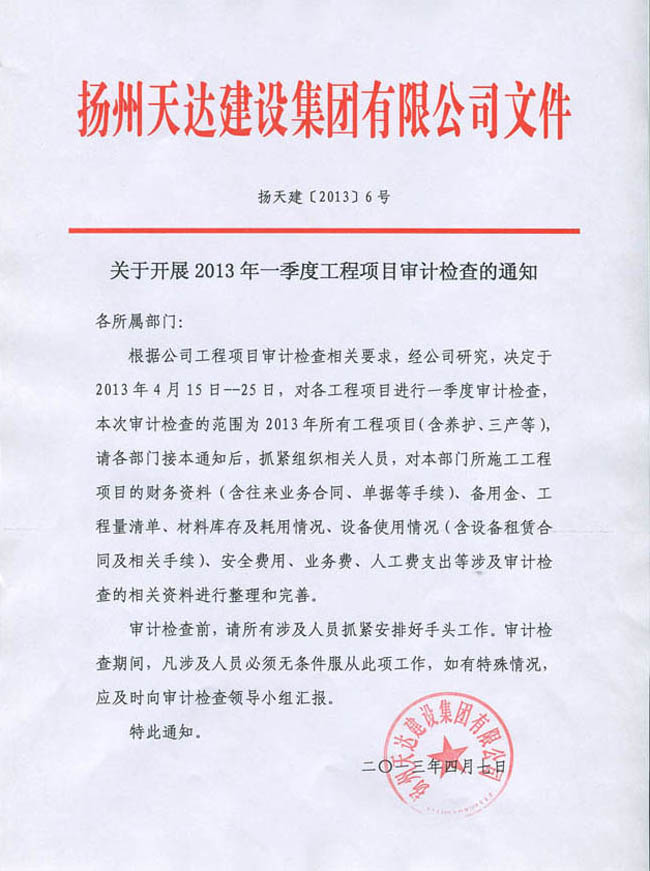 關(guān)于開(kāi)展2013年一季度工程項(xiàng)目審計(jì)檢查的通知