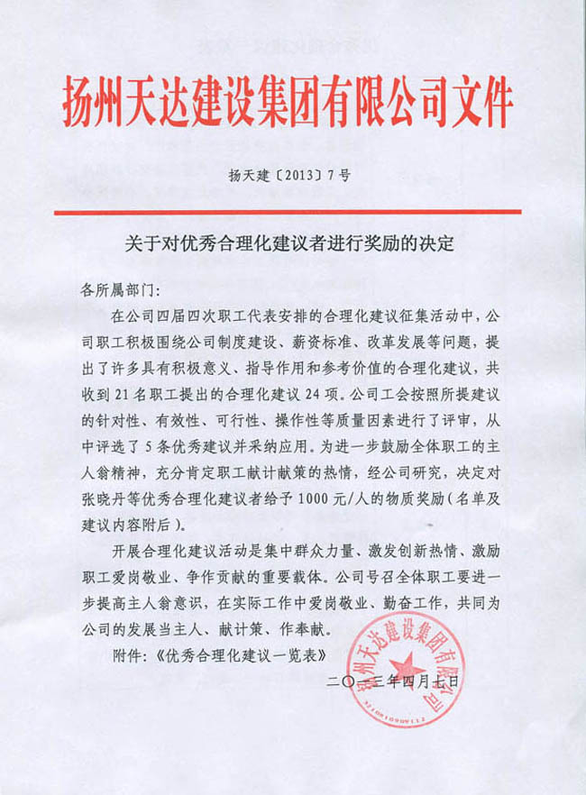 關(guān)于對(duì)優(yōu)秀合理化建議者進(jìn)行獎(jiǎng)勵(lì)的決定