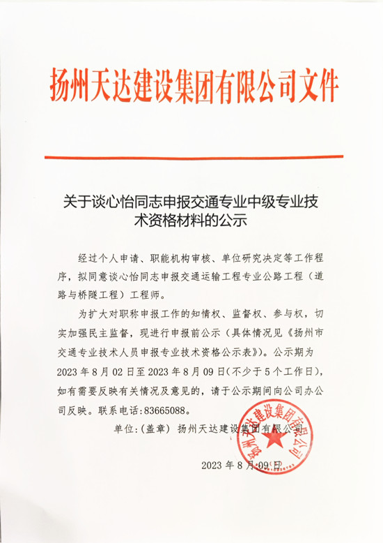 關(guān)于談心怡同志申報(bào)交通專業(yè)中級(jí)專業(yè)技術(shù)資格材料的公示