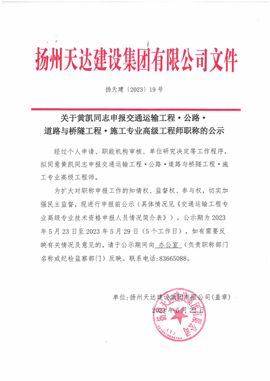 關(guān)于黃凱同志申報(bào)交通運(yùn)輸工程·公路·道路與橋隧工程·施工專業(yè)高級工程師職稱的公示