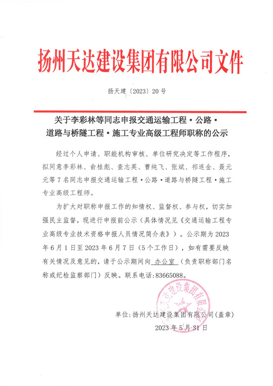 關(guān)于李彩林等同志申報(bào)交通運(yùn)輸工程·公路·道路與橋隧工程·施工專業(yè)高級工程師職稱的公示