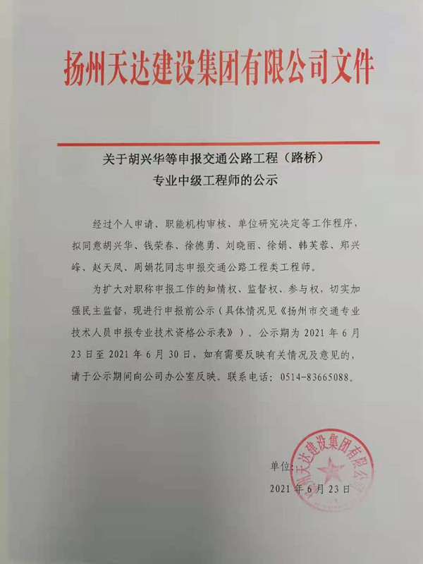 關(guān)于胡興華等申報(bào)交通公路工程(路橋)專業(yè)中級(jí)工程師的公示