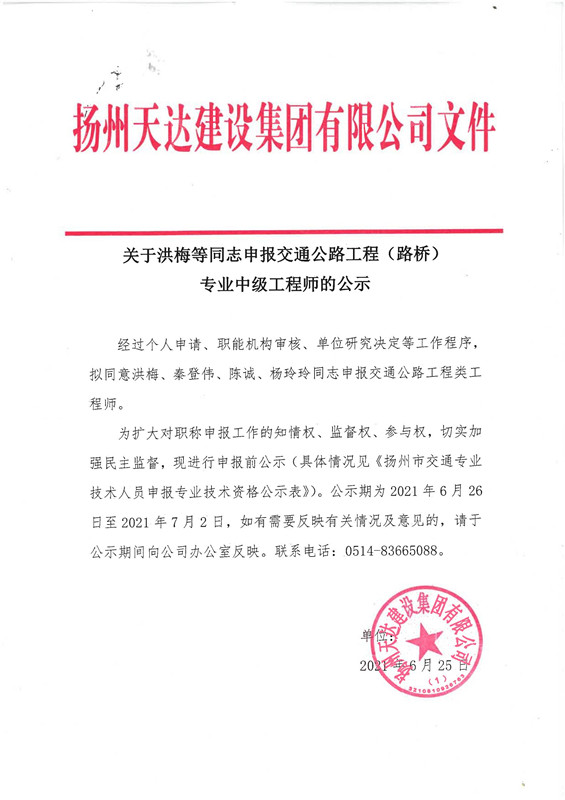 關(guān)于洪梅等同志申報(bào)交通公路工程(路橋)專業(yè)中級(jí)工程師的公示