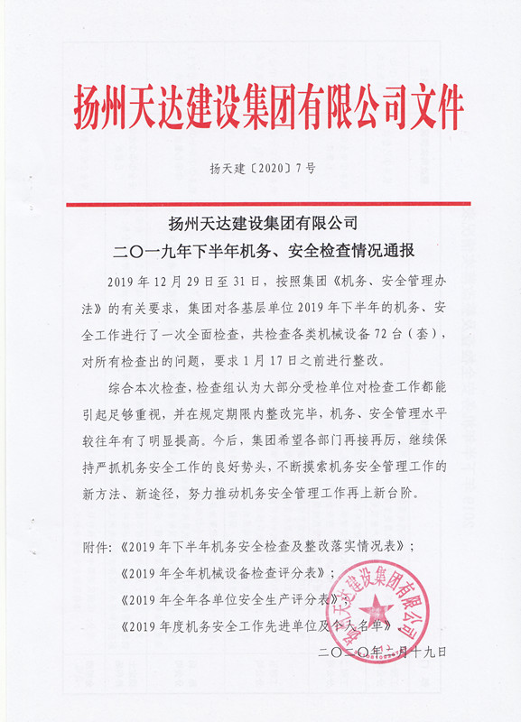 揚(yáng)州天達(dá)建設(shè)集團(tuán)有限公司2019年下半年機(jī)務(wù)、安全檢查情況通報(bào)