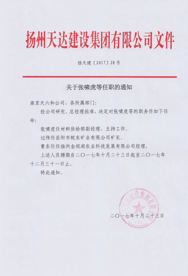 關(guān)于張嘯虎等任職的通知