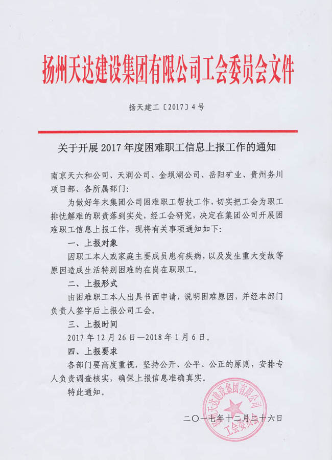 關(guān)于開展2017年度困難職工信息上報工作的通知
