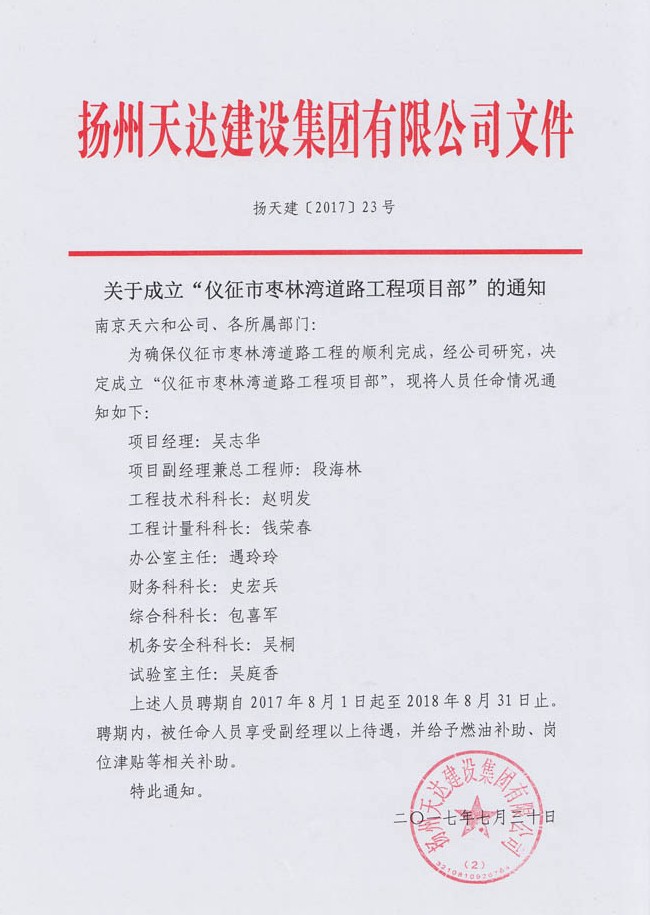 關于成立“儀征市棗林灣道路工程項目部”的通知
