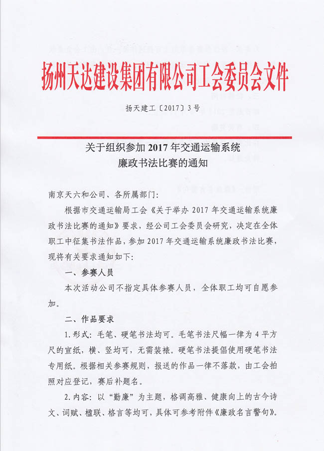 關(guān)于組織參加2017年交通運輸系統(tǒng)廉政書法比賽的通知