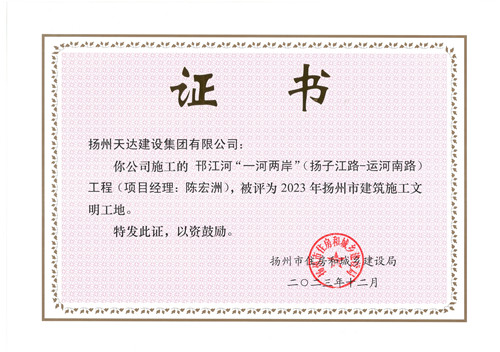 集團(tuán)施工的揚(yáng)州邗江河“一河兩岸”工程榮獲2023年揚(yáng)州市建筑施工文明工地榮譽(yù) 集團(tuán)施工的揚(yáng)州邗江河“一河兩岸”工程榮獲2023年揚(yáng)州市建筑施工文明工地榮譽(yù)