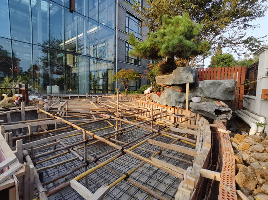 ▲10月初,集團投資約15萬元對機關(guān)綜合辦公樓南側(cè)景觀區(qū)域進行提升改造,將原有旱溪景觀改造為瀑布水系景觀,主要完成了清理石子、拆除素土、預埋管道、下墊層、上下水管道、綁扎鋼筋、澆筑混凝土、制作假山塑石等,改造后的水系景觀與原有的景觀魚池融為一體。另外,集團將機關(guān)新舊大院原有草坪全部替換成四季常綠的麥冬,共栽植約1800平方米,營造大院綠意盎然的景色,進一步提升了機關(guān)辦公區(qū)整體景觀層次。