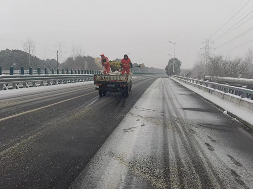 圖為356省道路面撒布融雪劑現(xiàn)場