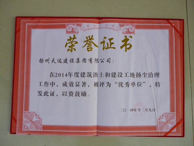 公司榮獲儀征市城市環(huán)境綜合治理工作推選小組授予的2014年度建筑渣土和建設(shè)工地?fù)P塵治理工作“優(yōu)秀單位”榮譽(yù)稱號(hào)。